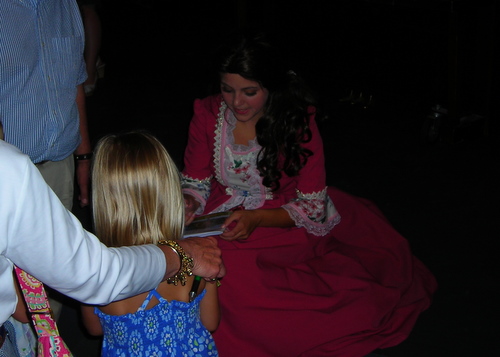 The only pictures I have are the cast during the impromptu sing-along, and Belle autographing for one of the girls in the audience.